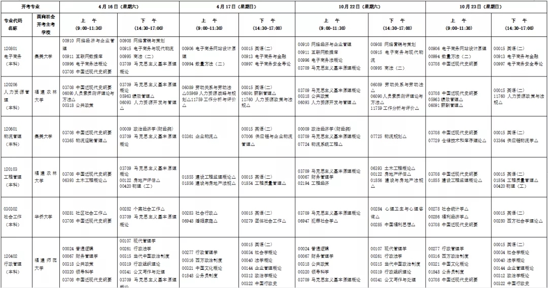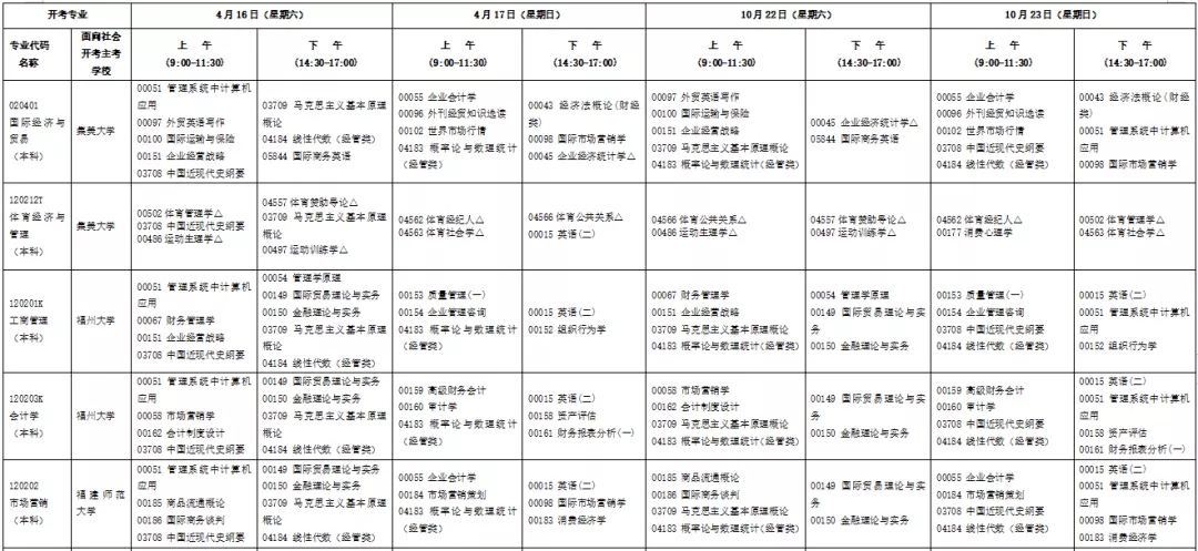 2022年4月和2022年10月福建省高等教育自学考试开考专业理论课程考试安排表