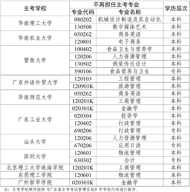 为优化我省高等教育自学考试主考学校结构,促进自学考试事业健康发展,根据《高等教育自学考试暂行条例》《广东省自学考试实施细则》及《广东省学士学位授权与授予管理实施细则》相关精神,结合我省主考学校实际情况,决定华南理工大学等11所高校不再担任我省高等教育自学考试部分专业的主考学校,现将有关事项通知如下: